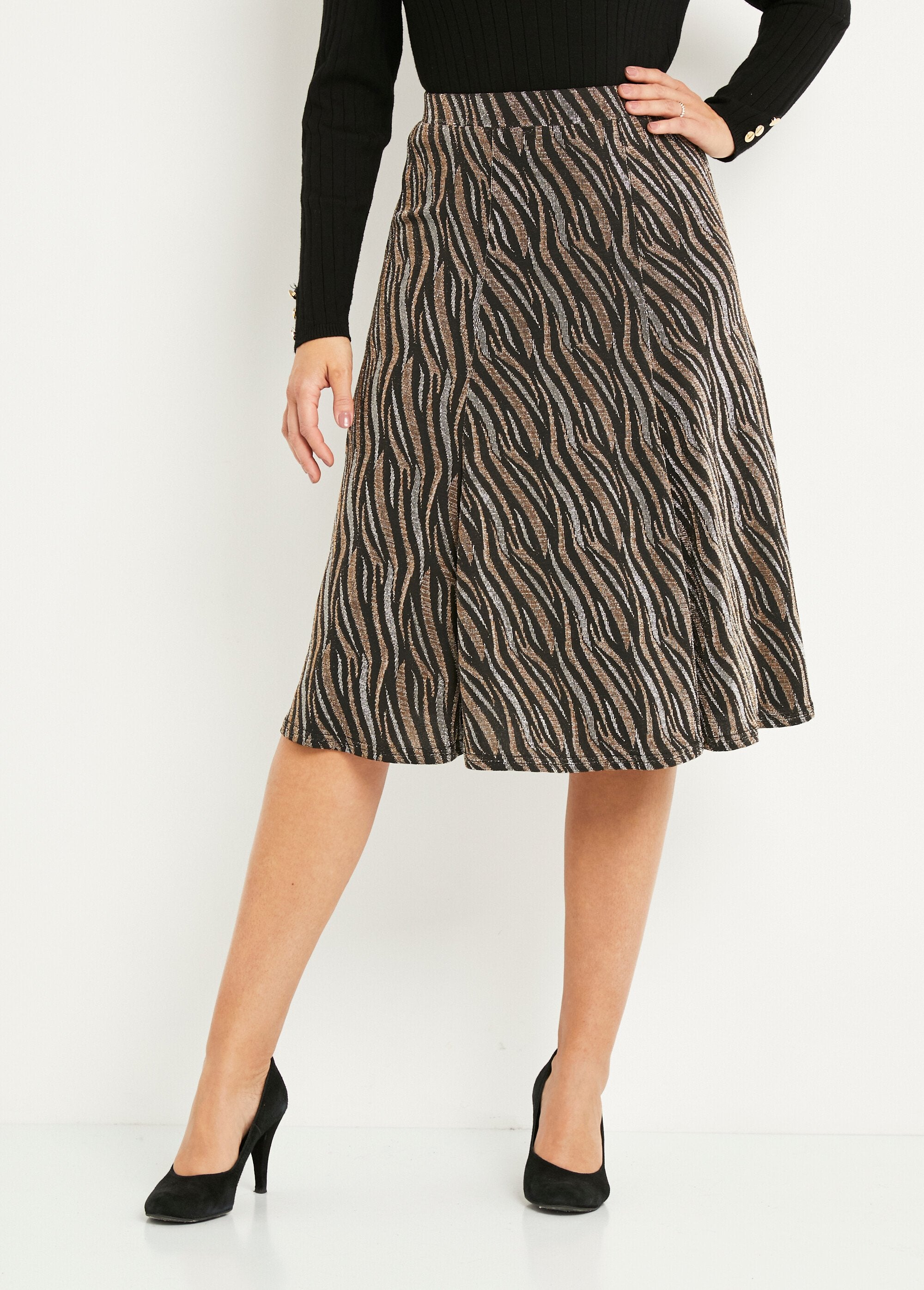 A graceful line suitable for both small and large sizes, a dancing movement that softens the silhouette, a graphic jacquard that lengthens it. Designed for festive occasions, the women's flared skirt is unrivaled for brightening up black pants or calming down a golden skirt.